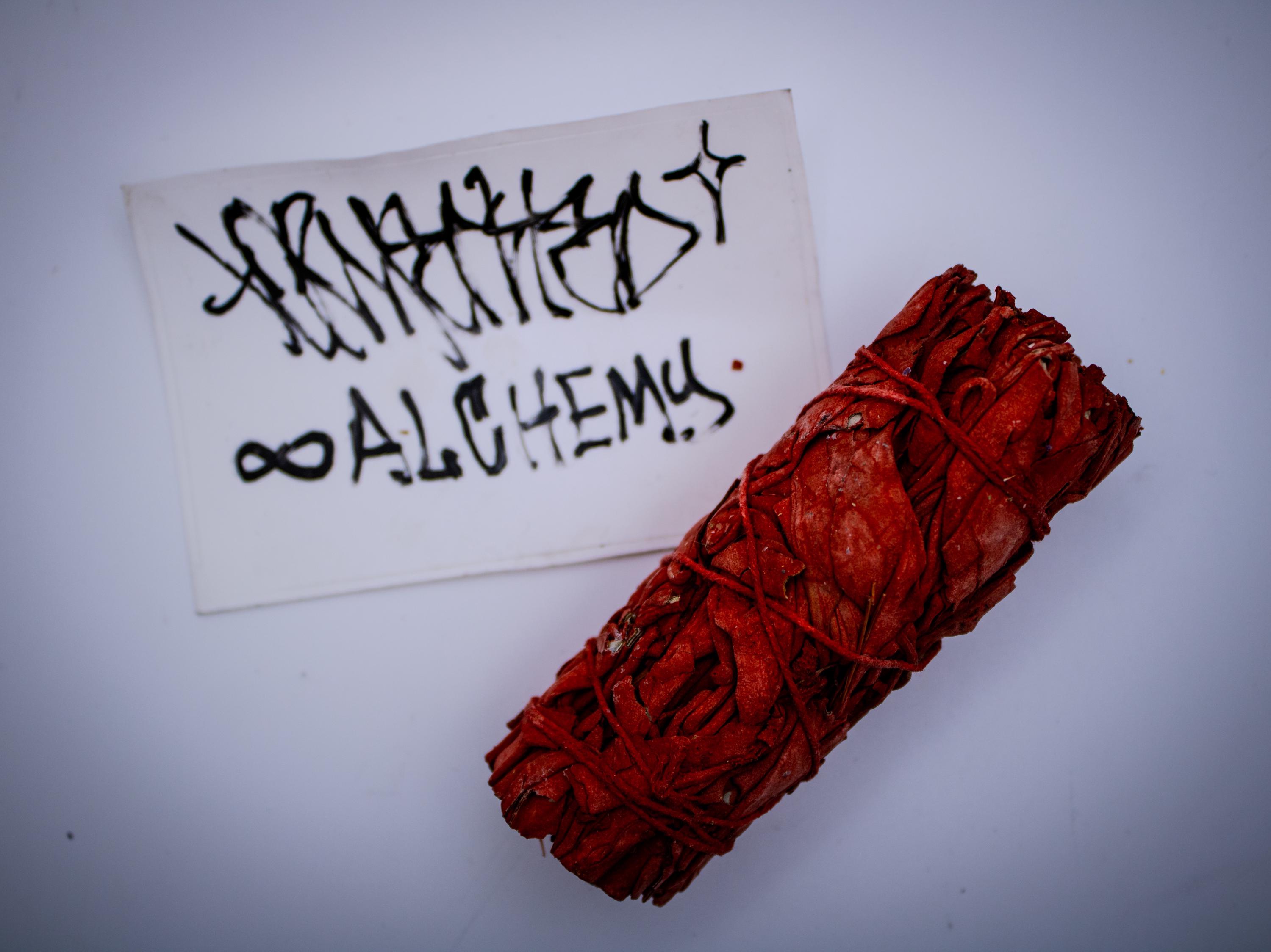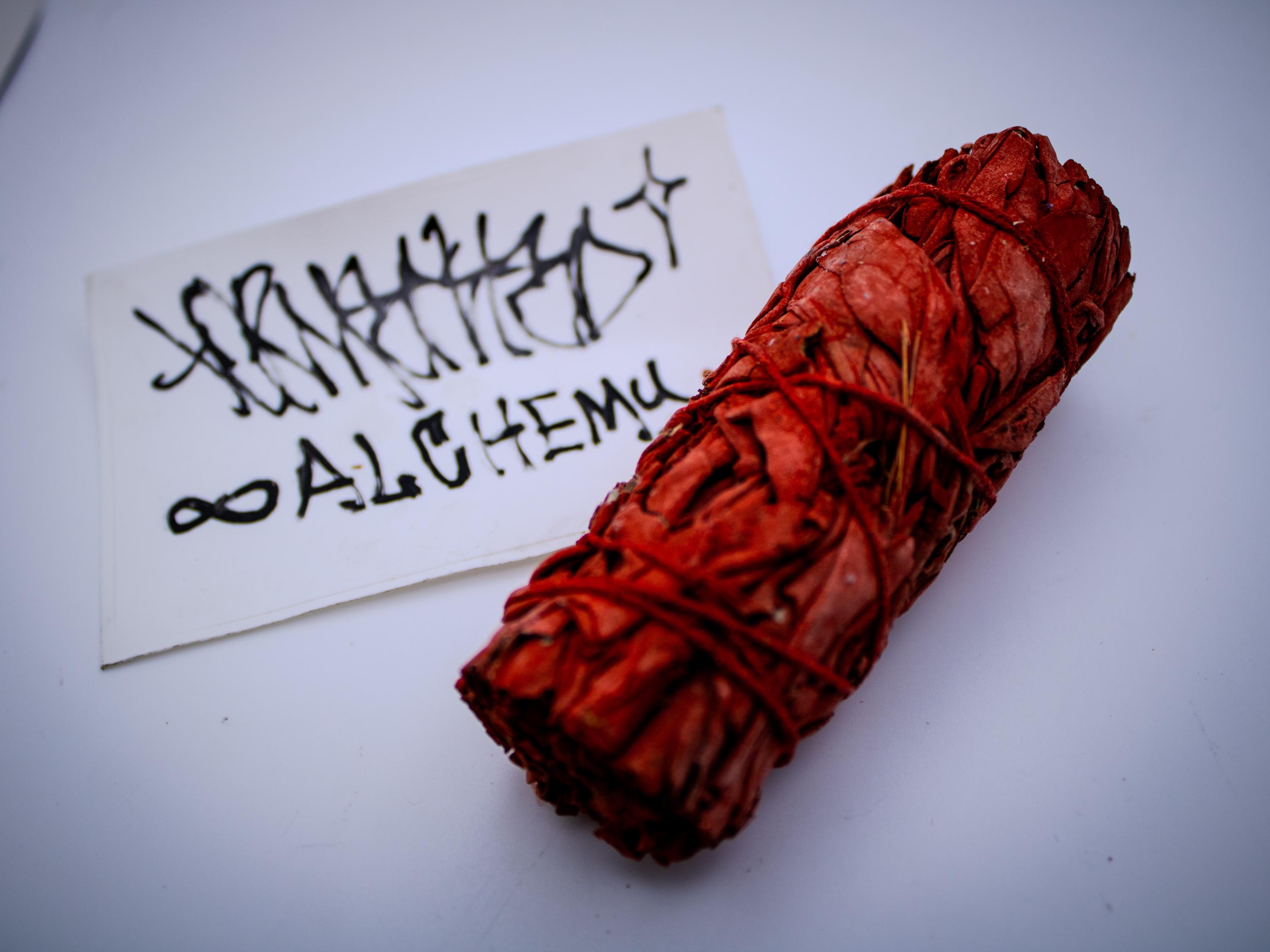 Dragon’s Blood Sage smudge stick for protection, energy cleansing, and ritual use. White sage coated in Dragon’s Blood resin. Curated by Tormented Alchemy